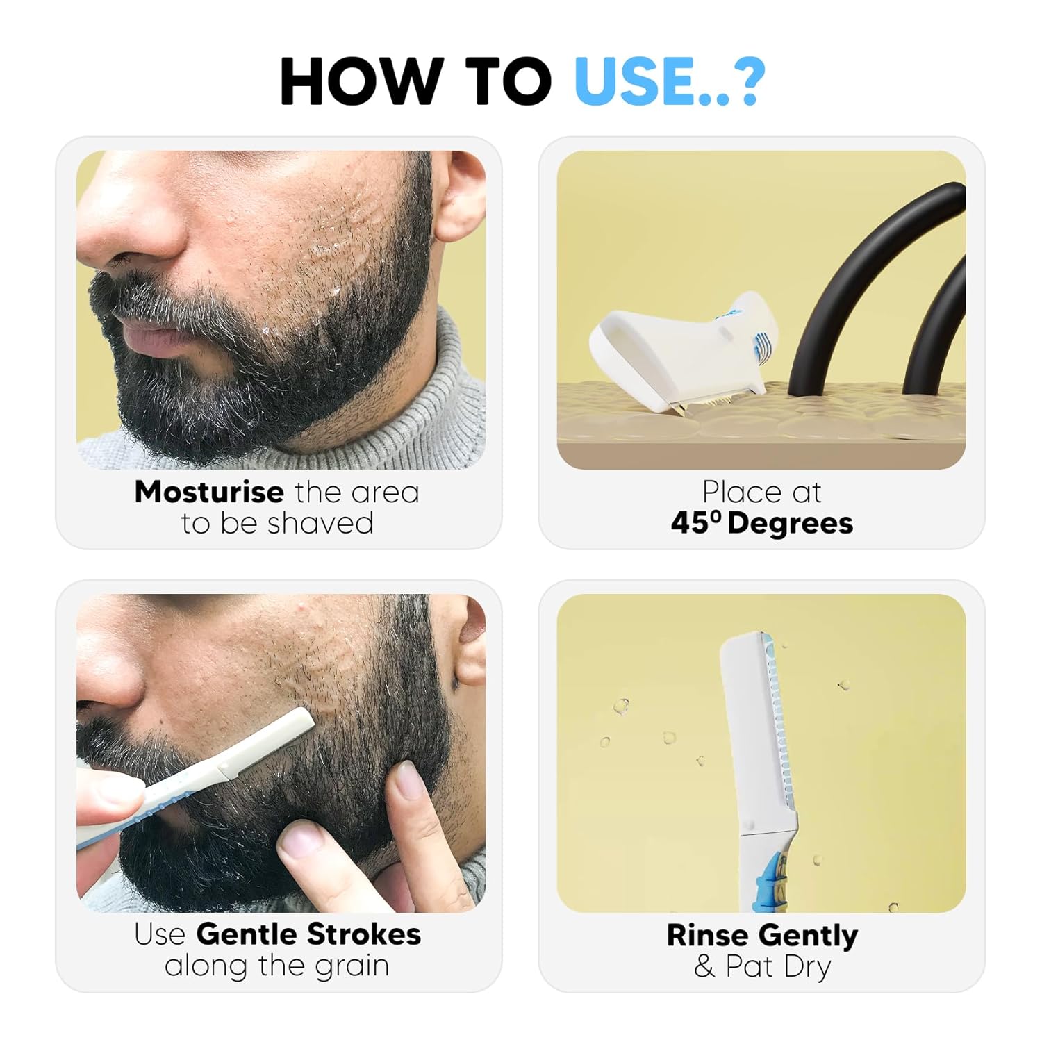 Moisturise skin, hold blade at 45 degrees & use short strokes.
