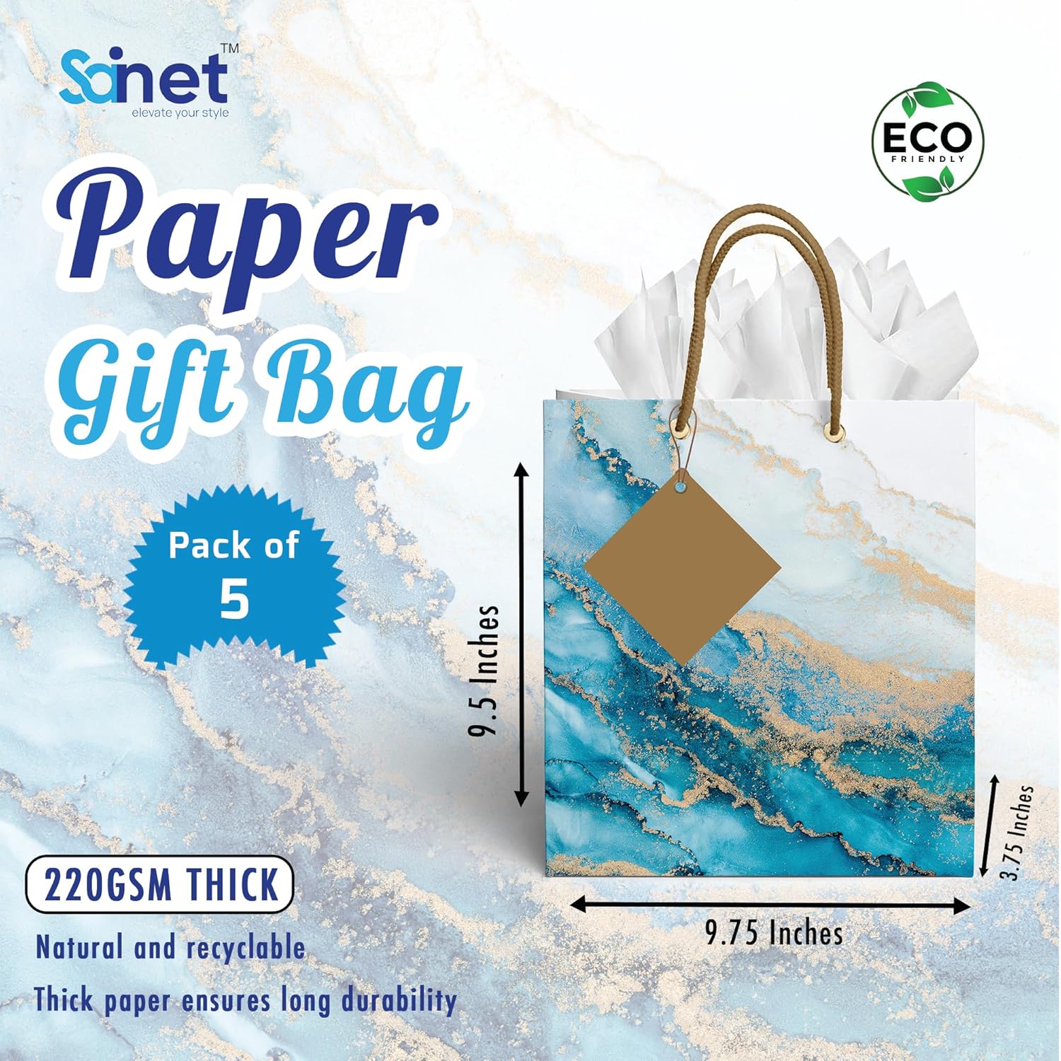Sainet™ Gift Bags – Paper Bags For Return Gifts – Paper Gift Bag – Medium – Carry Bags For Gifting – Goodie Bags With Tissue & Thank You Card – Gift Covers – Pack of 5, Blue Marble