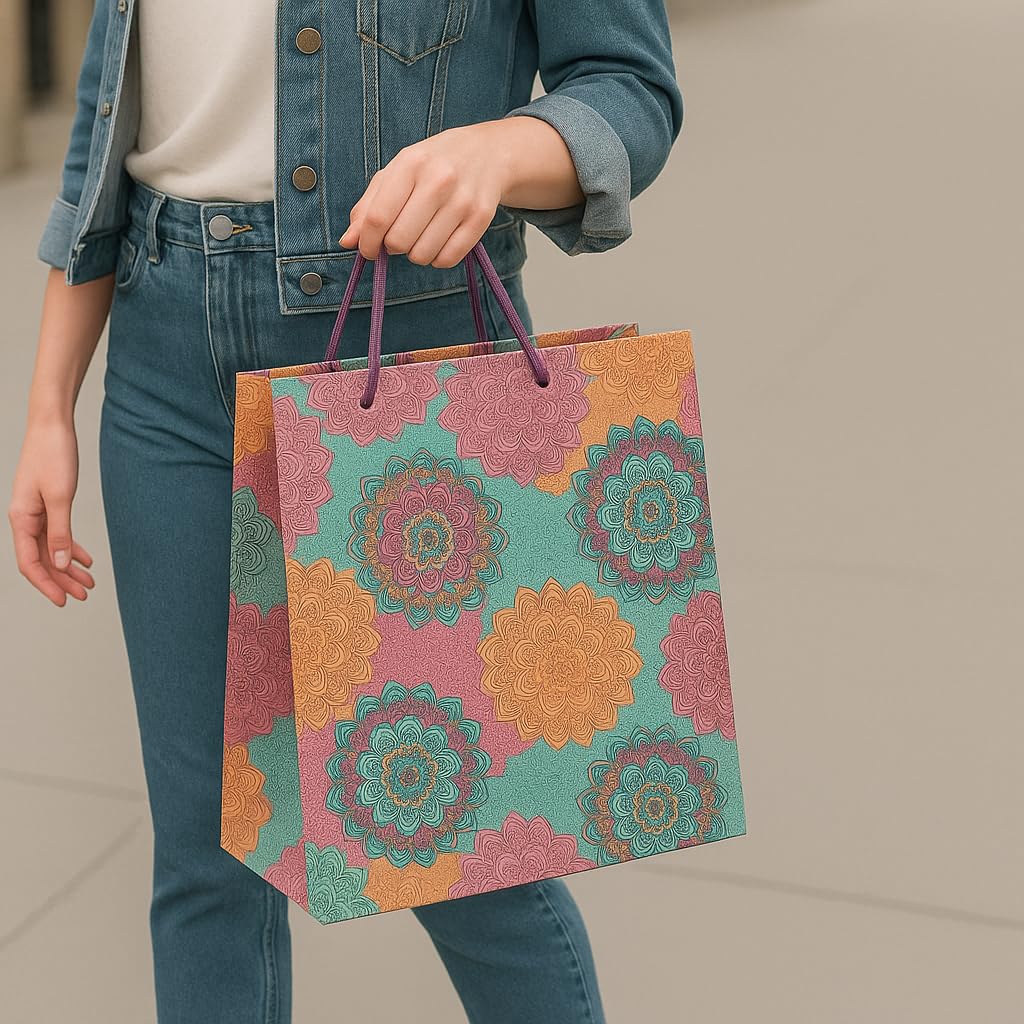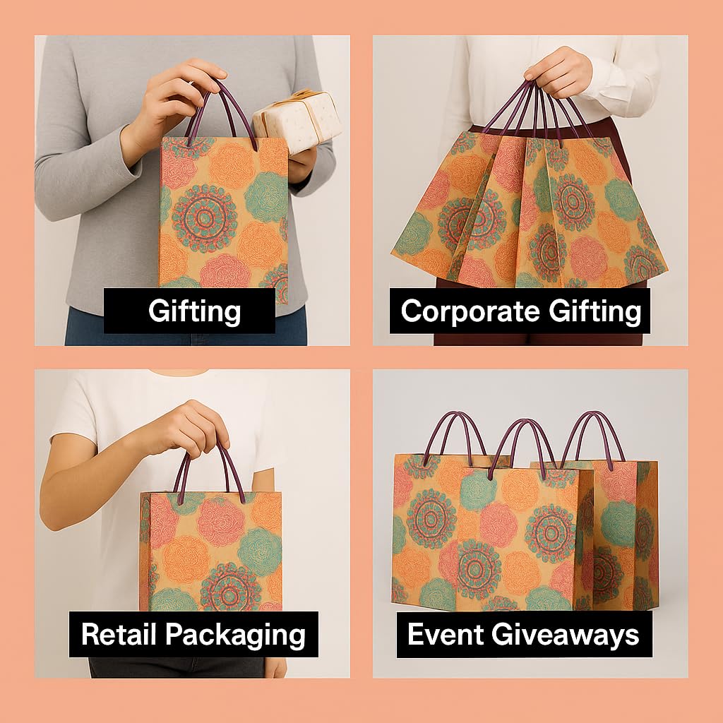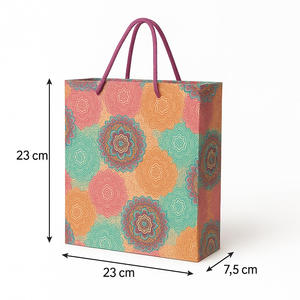 Add a touch of elegance to your gifting experience with this Mandala-inspired multicolour decorative gift bag. Crafted from long lasting kraft bag material, each bag combines complex circular prints with flowers, offering a reusable solution that is both sophisticated and sustainable. To make sure that your gifts can be carried without difficulty, the sturdy handles with magenta ropes gives comfortable grip. These medium-sized carry bags (23 × 23 × 7.5 cm) are perfect for return gifts, Kitty parties, birthday and festivals, wedding presents, party Favors and goodies. With holding capacity up to 2 kg, these bags can fit accessories, chocolates, jewellery, cosmetics, or various other items. These kraft gift bags are Reusable, Biodegradable, Recyclable and a perfect alternative to plastic bags, without compromising on style. Each pack contains 10 decorative paper bags, ideal for multiple occasions. Make every celebration memorable with these stylish and durable gift bags – the perfect blend of beauty and functionality for all your gifting needs.