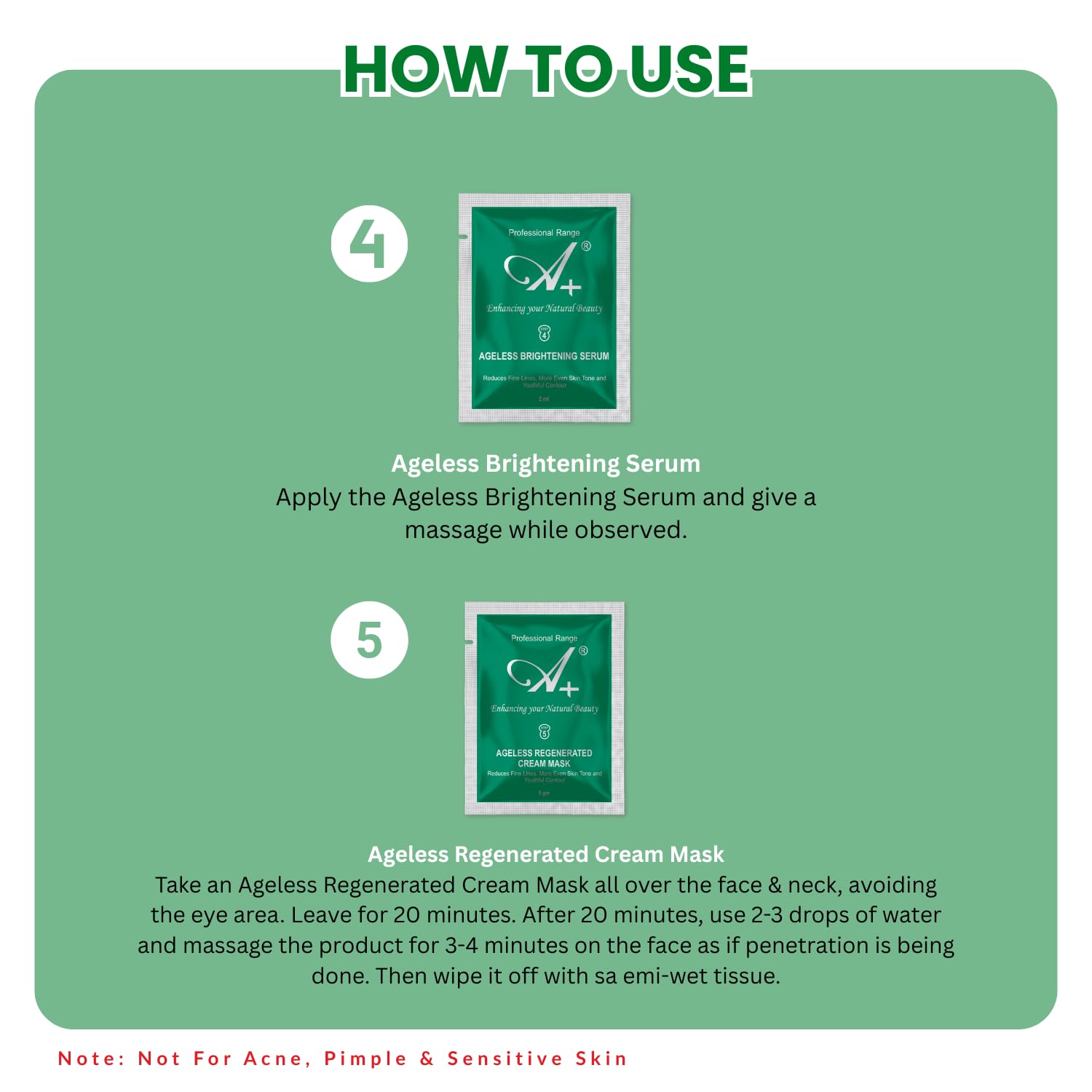 For best results, use the A+ Ageless Facial Kit once every 15–20 days. Regular use helps maintain glowing, youthful, and rejuvenated skin, keeping signs of ageing like dullness and fine lines at bay.