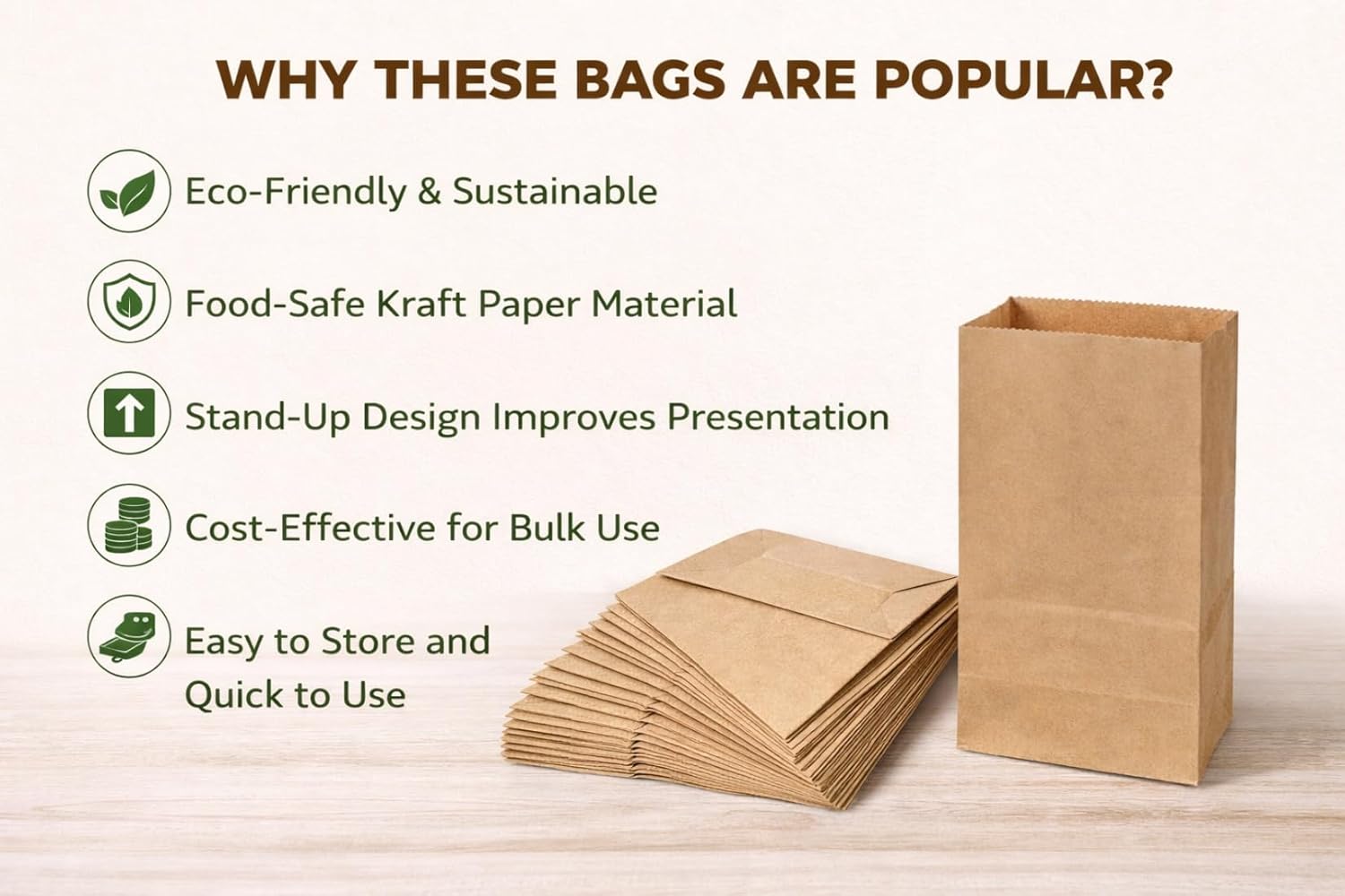 Tia Crafts eco-friendly brown kraft paper bags are designed for safe, hygienic, and sustainable food packing. Made from food-grade kraft paper, these bags are biodegradable, recyclable, and completely plastic-free—making them an excellent alternative to plastic carry bags. The square flat bottom design allows the bag to stand upright, improving convenience while packing and enhancing presentation at bakeries, cafés, grocery stores, and retail counters. With a practical size of 12×7.5×5 inches, these paper bags are ideal for packing bakery items, bread, cookies, snacks, fruits, groceries, lunch, tiffin, and takeaway food with ease. These paper carry bags are lightweight yet sturdy, helping keep food fresh, dry, and presentable. Suitable for both commercial use and home use, they are widely used for food packaging, gifting, party return gifts, office lunches, and daily grocery needs. Each pack contains 50 kraft paper bags with an approximate 1 kg capacity, making it a cost-effective bulk solution for businesses, shops, and eco-conscious users looking for reliable paper bags for food packing. – Food Packing paper brown bags with Flat-bottom that’s why these are the most convenient Food Delivery Bag – These snack packing bags or Shopping Bags for Grocery are specialized Delivery Bags – These bags are made with an eco-friendly biodegradable material. These bags can be recycled, reused and composted.