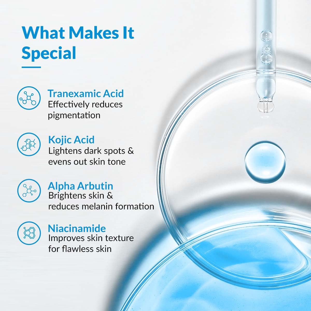 4 Powerful Actives Serum: Powered by 4% Kojic Acid, 3% Tranexamic Acid, 2% Alpha Arbutin, and 4% Niacinamide, an effective brightening serum that reduces acne scars, and evens out skin tone.